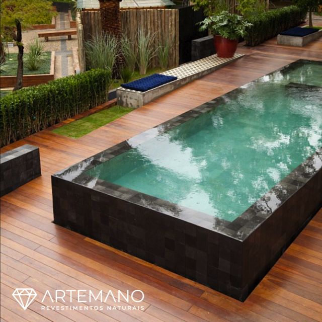 A Pedra Hitam Lisa é indicada para revestir piscinas e áreas molhadas devido à sua superfície lisa e uniforme, combinada com a grande variação de tons de cinza que fica mais escura quando molhada, conferindo ao ambiente um visual sofisticado e moderno.